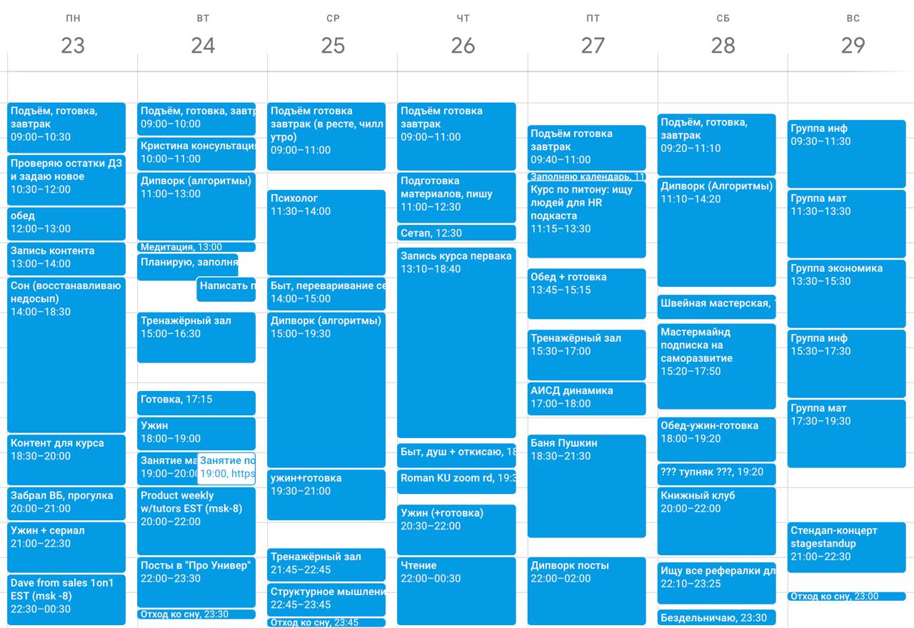 Я тут работал с коучем и нужно было заполнять неделю, сначала план, потом факт. В факте у меня продолбалось 2 часа в неделе вникуда, но это всё ещё очень продуктивная неделя была.